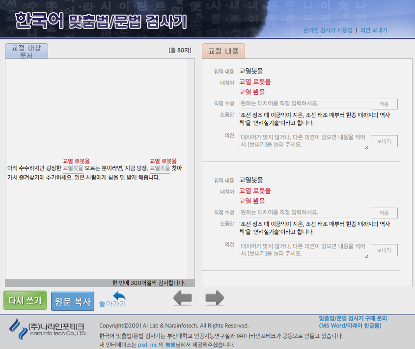 겉모습은 참 수수합니다만, 굉장한 교열봇입니다. 개인이나 학생은 무료로 사용할 수 있어서 더 굉장합니다. 저는 수강생들에게 자신이 쓴 글을 그대로 타이핑해서 교열봇에게 교열 지도를 받으라고 합니다. 그리고 틀린 내용을 노트에 기록해오게 합니다. 저도 교열봇으로 많은 오류를 잡아내고, 초고를 마무리한 후에는 반드시 교열봇의 도움을 받습니다. 이것이야말로, 4차 산업 혁명의 구체적 혜택이 아닌가 생각합니다.