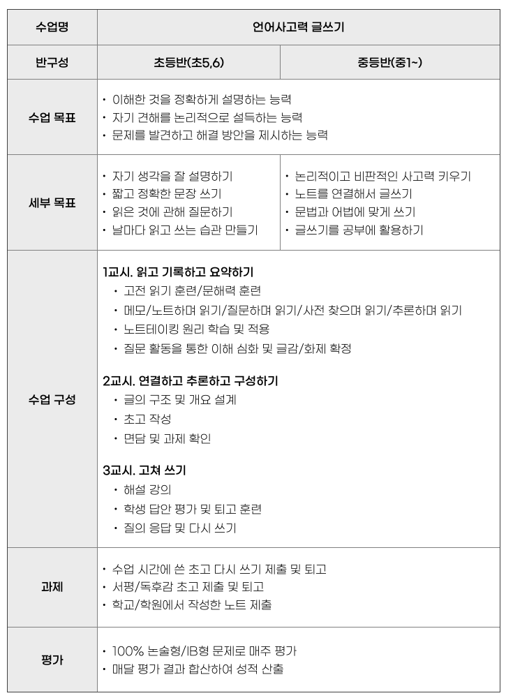 쓰다글쓰기센터의 문을 엽니다. 2021.10.01 12:20 공지사항 글선생 심원입니다. 대치동에서 초중고등학생에게 글쓰기를 가르치는 쓰다글쓰기센터의 문을 엽니다. 초중등학생 대상 수업명은 <언어사고력 글쓰기>입니다. 반구성과 수업 내용은 아래와 같습니다. 대치동 현장 강의를 듣기 어려운 분들은 온라인 피드백 수업도 있으니 참고하세요. 모든 수업은 평가 및 면담 후 참여할 수 있습니다. 입학 평가 문의 : 02.555.9975 공유하기 게시글 관리 쓰다