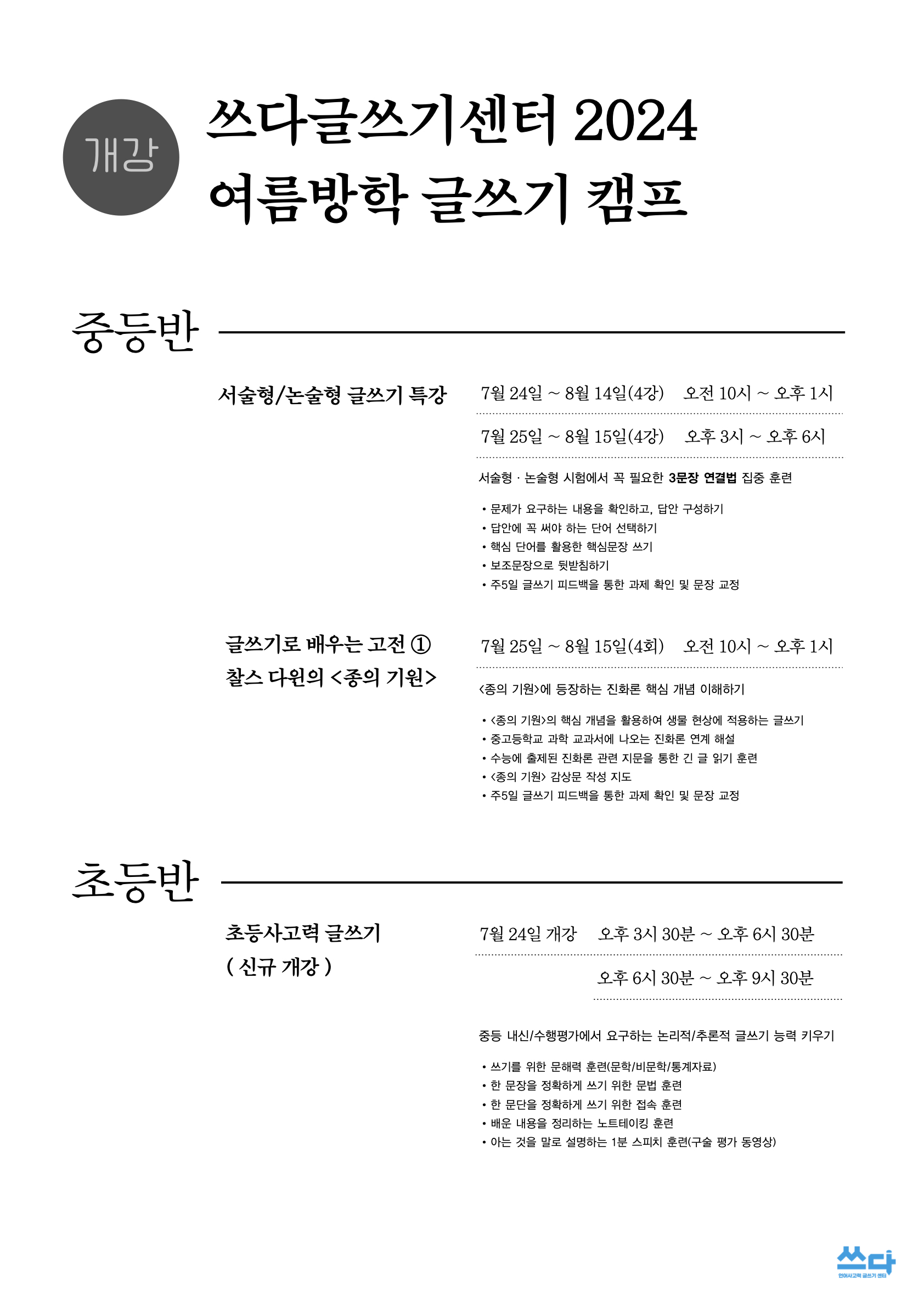 2024년 여름방학 글쓰기 캠프 2024.06.17 11:05 공지사항 동영상 안내 바로가기 중등 글쓰기로 배우는 고전 특강 https://youtu.be/cwLXfv3oDnA 중등 서술형/논술형 글쓰기 특강 https://youtu.be/Y0_nMtfG-o4 초등 사고력 글쓰기 신규 개강 https://youtu.be/VJ5pZeyW5Os 공유하기 게시글 관리 쓰다 저작자표시 비영리 변경금지 (새창열림)